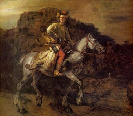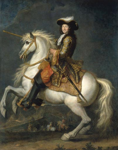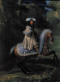 Rembrandt - Polnischer Reiter Rembrand hat von der polnischen Reiterei wohl nicht viel gehalten, sonst hätte er diesen unbekümmerten Bogenschützen nicht auf eine solche abgeklapperte Maehre gesetzt, die kurz vor dem Niederbruch zu stehen scheint. Rene Antoine Houasse - Louis XIV - 1679 abgesehen von Einelheiten des Kopfes ein gelungenes Pferd, leider sitzt der Reiter nicht an der richtigen Stelle. Auch Houassa scheint keine eigenen reiterlichen Erfahrungen zu haben, er hätte sonst den Reiter nicht auf dem Hals des Pferdes plaziert. Auch die folgenden vier Bilder weisen grobe Mängel auf, die offenbar weder dem Maler noch dem Käufer bzw. dem Abgebildeten aufgefallen sind. |