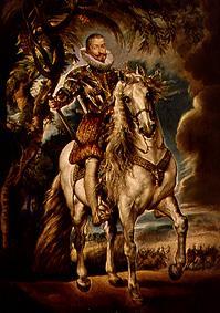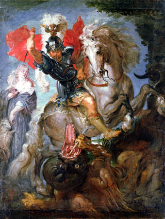 Peter Paul Rubens - St.Georg zu Pferde An Ausdruck nicht zu überbieten, aber auch die Harmonie zwischen Reiter und Pferd ist beeindruckend. Rubens muß zumindest hervorragende Reiter und vollendet ausgebildetet Pferde gesehen haben, um solche Szenen malen zu können. Das Reiterbild des Herzogs von Lerma scheint weniger gelungen. Es ist ein Auftragswerk, das möglicherweise in der Rubenswerkstatt in Teilen von Schülern erstellt wurde. Auch dieses Pferdebild zeigt aber, dass der Maler eingehende Studien über Pferde betrieben hat, wenn er nicht eine besondere Beziehung zu ihnen hatte. |