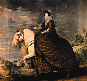 Velasquez - Phillipp IV zu Pferde - 1636 Der Maler, der dieses Bild abgeliefert hat, versteht vom Reiten nichts. Das Pferd hat einen ängstlichen Gesichtsausdruck und scheint unkontrolliert. Der Sattel und damit der Reiter sind viel zu weit vorn plaziert. Der Reiter wirkt geziert und scheint sich unsicher zu fühlen. Hätte Velasquez reiterliches Enfühlungsvermögen besessen, hätte er dieses Bild nicht aus seiner Werstatt gelassen. Auch Das Bildnis der Isabella Bourbon, Gemahlin von Phillip IV gelingt nicht überzeugend. Kopf und Hals des Pferdes passen nicht aneinander. Der Gesichtsausdruck des Pferdes ist wieder angespannt, die Reiterin nicht losgelassen. |