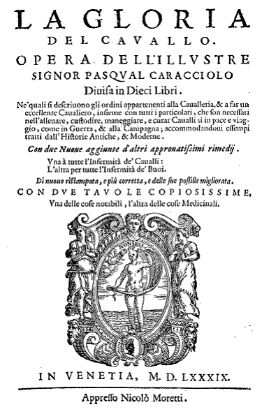 Zum Ruhm des PferdesEin Werk des berühmten Herrn Paqual CaraccioloAufgeteilt in Zehn Bücher. in denen beschrieben wird die Ordnung betreffend der Reiterei, einen ausgezeichneten Reiter zu machen, zusammen mit allen Einzelheiten, die nötig sind zur Aufzucht, Verwahrung, Handhabung und Heilung von Pferden im Frieden auf Reisen wie auch im Krieg, und in der Landschaft, verbessert mit Beipsielen gezogen aus der Geschichte Alt und modern. Mit zwei neuen Zusätzen von anderen wichtigem Zubehör, eins für alle Krankheiten der Pferde, das andere für alle Krankheiten der Rinder. Aufs neue gedruckt und mehr korrigiert und bis auf höchstmögliche verbessert. Originaltext |