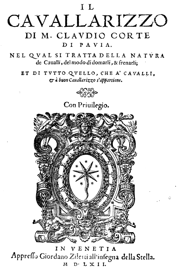 Der (Kunst)Reitervon Claudio Corte aus PaviaMit Abhandlungen über die Natur der Pferde, die Kunst sie einzureiten und zu zäumen sowie von allem, was zu den Pferden und zu einem Kunstreiter gehört. Mit Erlaubnis in Venedig gedruckt von Giordano Ziletti mit dem Markenzeichen des Sternes. Das Buch ist heute weniger bekannt als Grisones 'Ordini di cavalcare', wurde aber im 16. Jahrhundert als mindesten gleichrangig bewertet und in mehrere Sprachen übersetzt. So von Thomas Bedingfield (London 1584) unter dem Titel: 'The art of riding'. Man ist sicher, dass Shakespeare das Buch gelesen hat, da dessen Beschreibung eines guten Pferdes in seinem Werk 'Venus und Adonis' an Bedingfields Text stark angelehnt ist. Zum Originaltext |