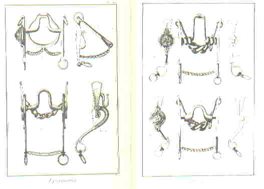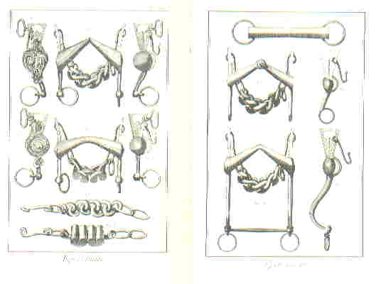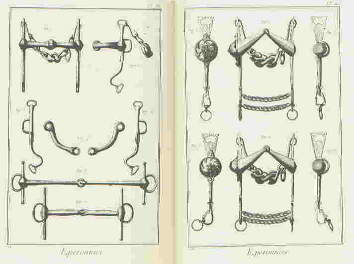 Éperonnier (Sporenmacher)L'Éperon ist mit Sporn zu übersetzen. Der "Sporenmacher" fertigte aber auch Gebisse und Steigbügel an.Auf dieser Bildtafel sind Einzelteile einer Kandarre zu erkennen. Hier und auf den weiteren Tafeln finden wir ein große Anzahl von verschiedensten Gebissen. |