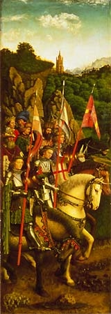 links: Jan van Eyck - Die Streiter Christi Das linke Bild des brühmten Genter Altars von 1432 zeigt ein gerittenes Pferd in schöner Aufrichtung, ein Beweis für das hohe Niveau der Reitkunst in der Renaissance. Es wird von seinem Reiter mit "falschen Zügeln" beidhändig geführt, wie es Guérinière für Pferde empfielt, die sich noch in der Ausbildung befinden. ![]() Das Fresco aus dem Palazzo Publico in Siena von 1328 stellt einen sienesischen Heerführer dar, der es offenbar eilig hat. Der Vergleich mit den beiden Nebenbildern zeigt, dass es in der Renaissance wie zu allen Zeiten auch schwache Reiter gegeben hat, die ihr Pferd bei weggedrücktem Rücken nicht beizäumen konnten. Die Zäumung ist für schlechte Reiter geeignet. Nur die leichte Zügelhand spricht zu Gunsten des vornehmen Herren. |